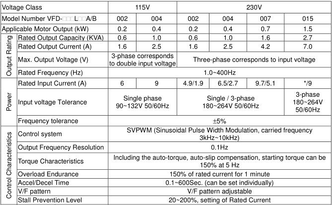 This series is designed for small-horsepower motor design, built-in EMI filter, effectively suppress electromagnetic interference. Specifications *Output frequency 1.0 ~ 400Hz
