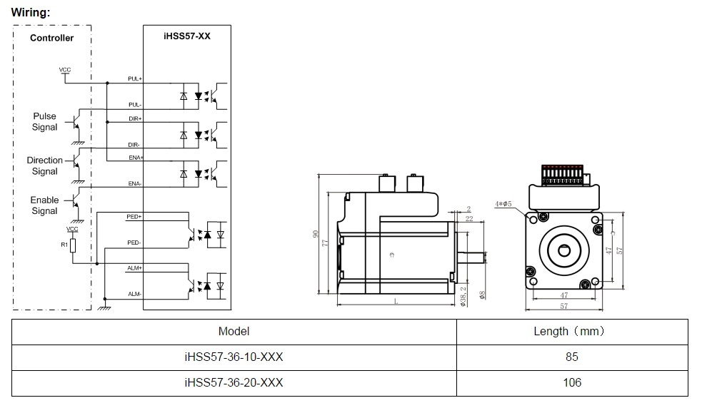 JMC IHSS57 Integrated Closed Loop Stepper Motor is all-in-one closed loop stepper system which integrates closed loop stepper motor with digital driver. Servo control and digital stepper driving technology are perfectly merged into this smart system. Optical encoder with high speed position sampling feedback of 50μs built inside, can help system avoid losing-step, greatly improve low-speed instability and reduces noise. This Series products have the advantages of both stepper and servo, features in low heat, smooth motion, fast response, high speed and big torque output.